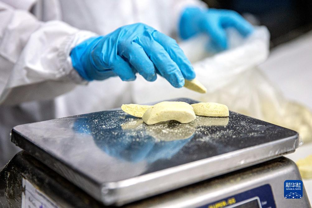 8月17日,在泰国尖竹汶府,尖竹汶果品公司工作人员称重榴莲干。新华社记者 王腾 摄