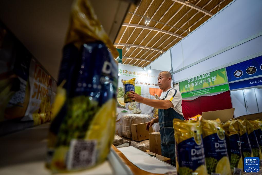 8月14日,泰国华商陈杰在南博会开幕前在展柜上摆放榴莲干。新华社记者 胡超 摄