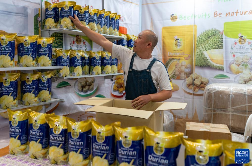 陈杰在昆明滇池国际会展中心自己的展位上摆放榴莲干(8月14日摄)。新华社记者 陈欣波 摄