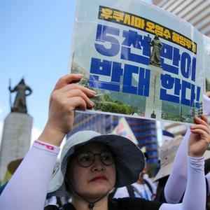 当日,韩国最大在野党共同民主党成员和众多市民聚集在首尔光化门广场,手举标语进行示威游行,抗议日本核污染水排海。日本政府24日启动福岛核污染水排海,这一决定遭到国际社会的批评和反对。
