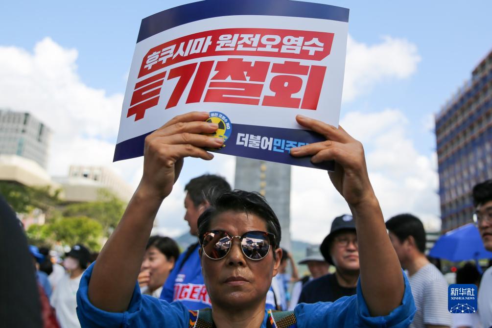 当日,韩国最大在野党共同民主党成员和众多市民聚集在首尔光化门广场,手举标语进行示威游行,抗议日本核污染水排海。日本政府24日启动福岛核污染水排海,这一决定遭到国际社会的批评和反对。