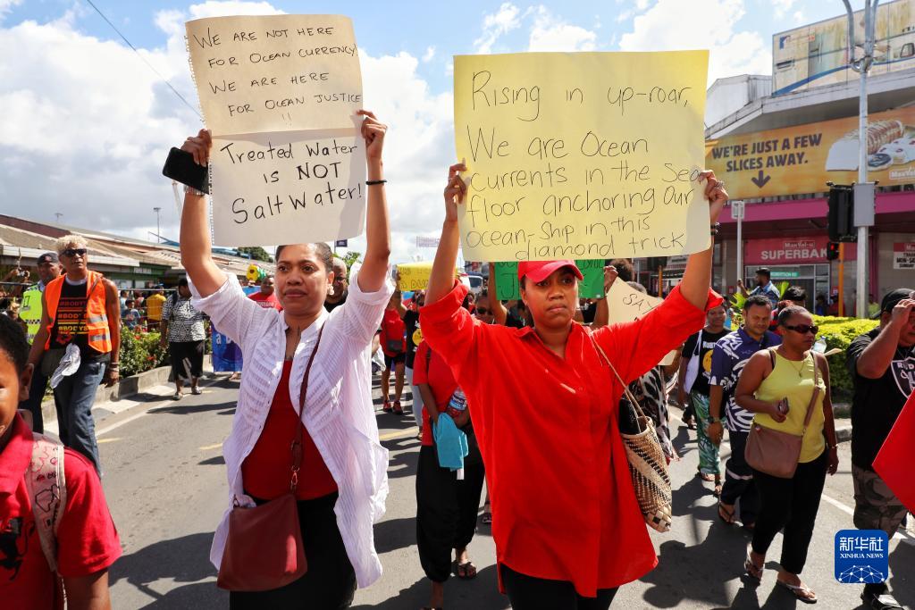 当日,数百名斐济民众沿街游行,强烈抗议日本政府启动福岛第一核电站核污染水排海,呼吁国际社会采取行动保护太平洋生态和子孙后代的福祉。