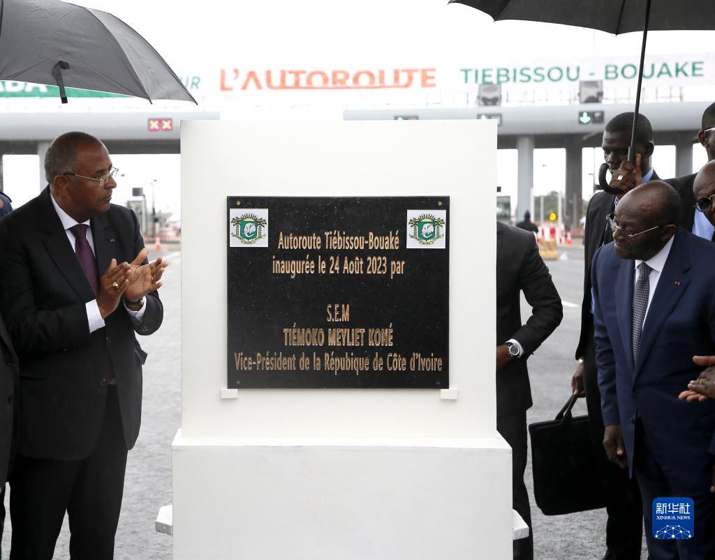 8月24日,在科特迪瓦布瓦凯市,科特迪瓦副总统科内(前右)、总理阿希(左)为铁布高速公路项目揭幕。新华社发(伊万·宋摄)