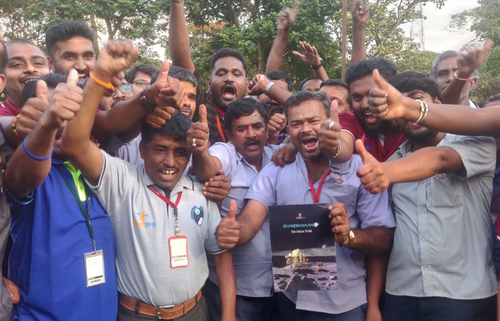 8月23日,在印度班加罗尔,印度空间研究组织的工作人员庆祝印度月球探测器在月球南极成功着陆。新华社发