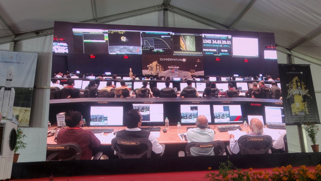 8月23日,在印度班加罗尔,一处大屏幕播放印度月球探测器相关直播画面。新华社发