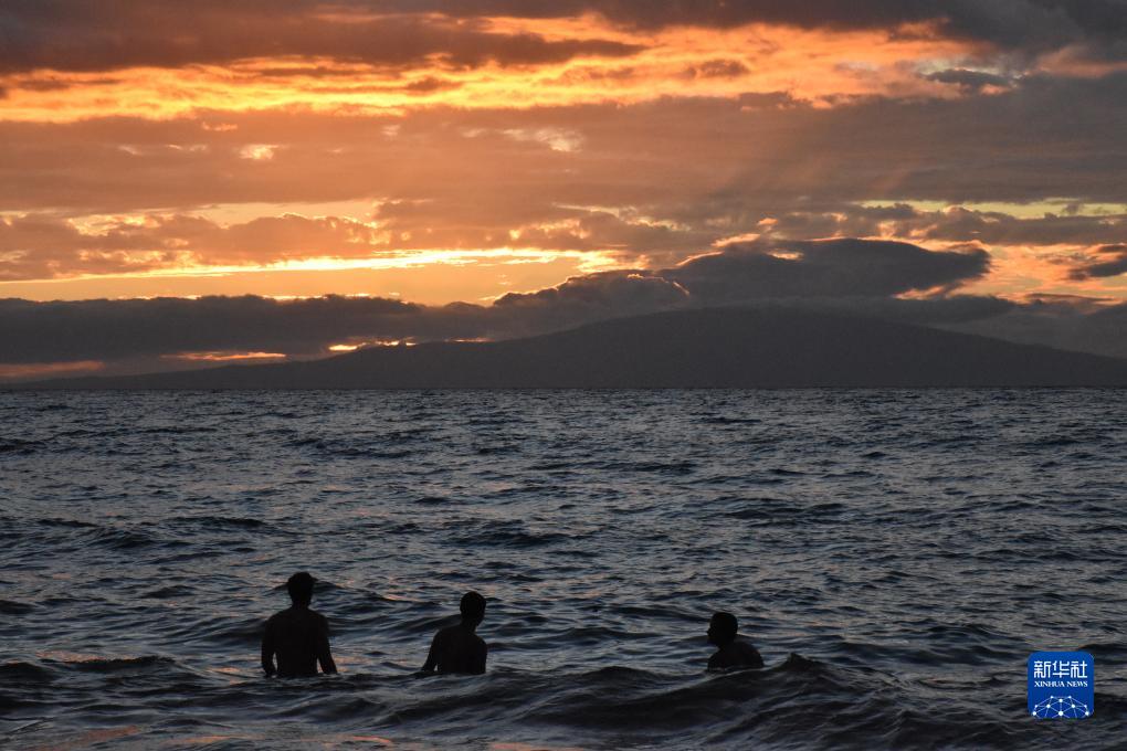 8月21日,人们在美国夏威夷毛伊岛的海边观看日落。
