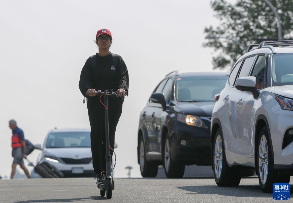 8月26日,在加拿大温哥华,一名女子骑着电动滑板车在烟雾笼罩的街道上行驶。