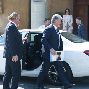 8月28日,在塞浦路斯尼科西亚,联合国负责欧洲、中亚和美洲事务的助理秘书长米洛斯拉夫·延恰(前中)与塞浦路斯希腊族领导人、总统赫里斯托祖利季斯(前右)举行会谈。