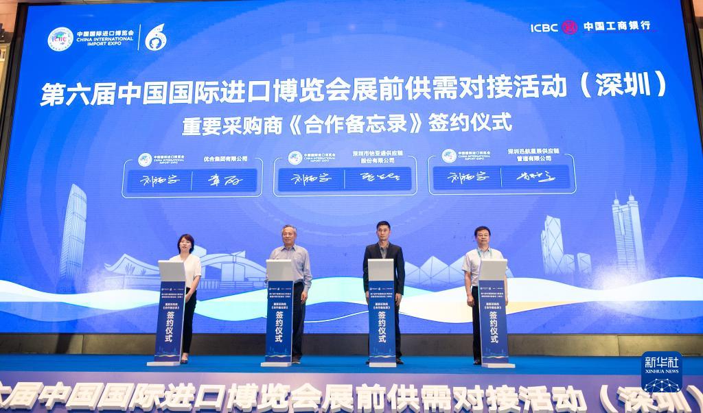 8月29日在第六届中国国际进口博览会展前供需对接活动(深圳)上拍摄的重要采购商《合作备忘录》签约仪式。