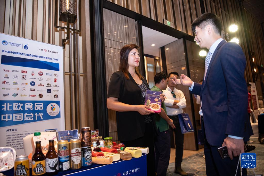 8月29日,在深圳举行的进博会展前供需对接活动上,采购商(右)了解北欧食品。