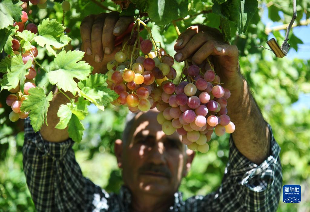 8月29日,在叙利亚大马士革,农民收获葡萄。