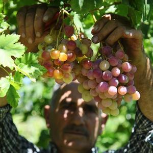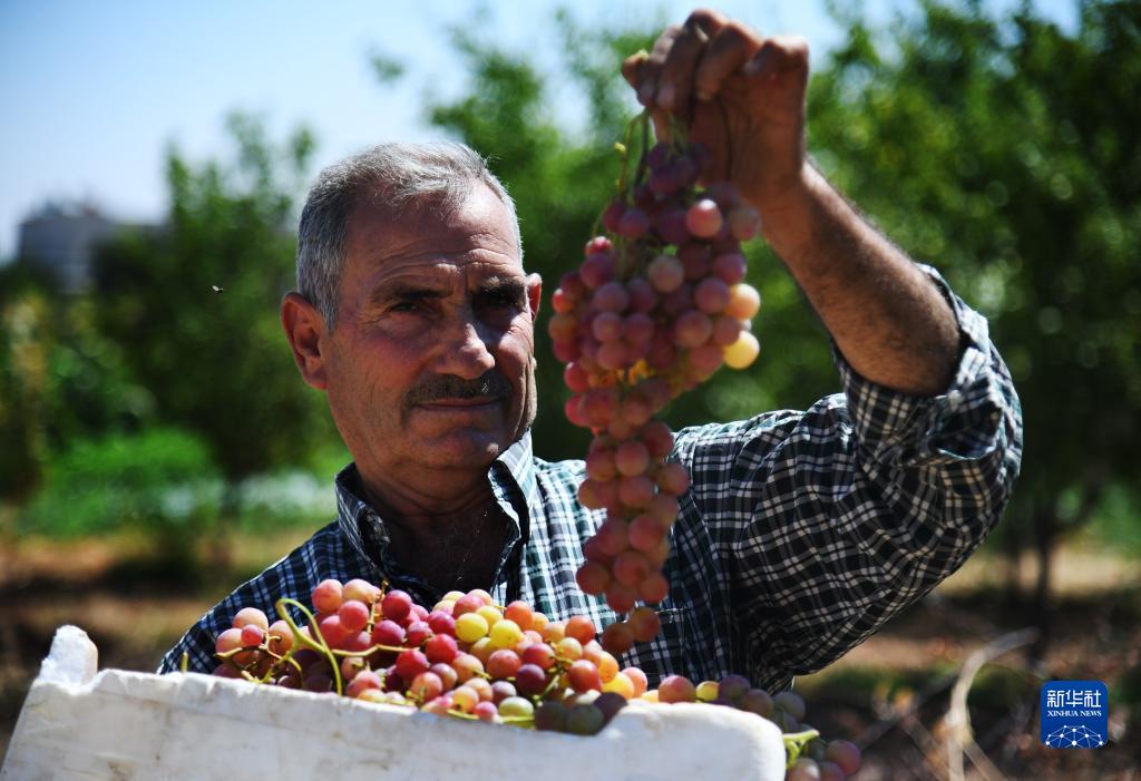 8月29日,在叙利亚大马士革,农民收获葡萄。
