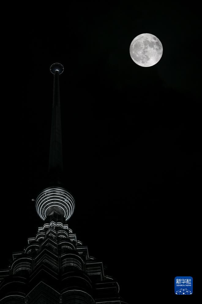 8月30日,“超级月亮”在马来西亚吉隆坡双子塔上空升起。