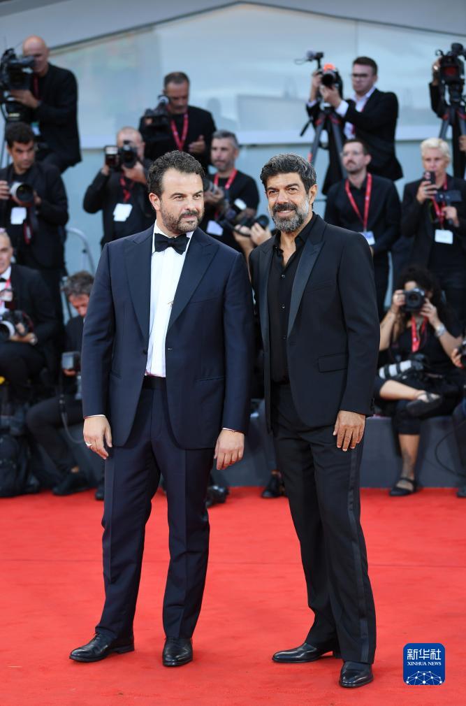 8月30日,在意大利威尼斯,开幕影片《指挥官》导演爱德华多·德·安杰利斯(左)和演员法维诺亮相开幕式红毯。