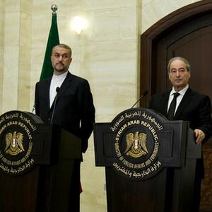 8月30日,在叙利亚大马士革,叙利亚外长梅克达德(右)和伊朗外长阿卜杜拉希扬出席联合记者会。新华社发(阿马尔·萨法尔贾拉尼摄)