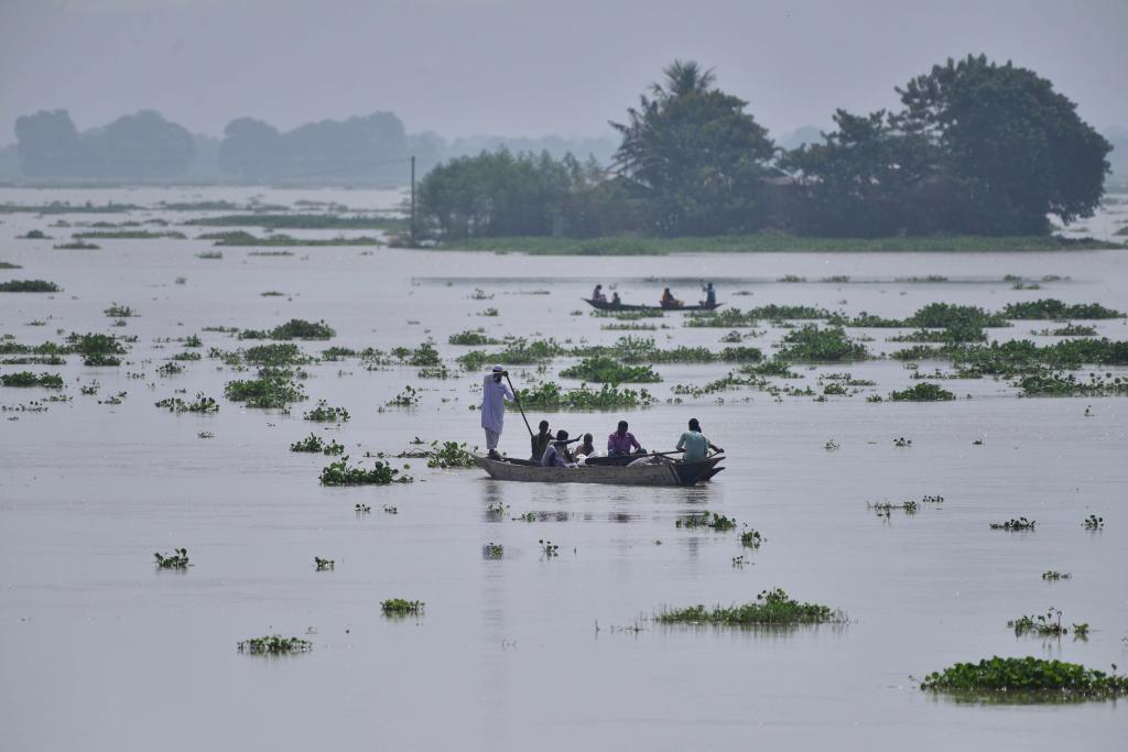 8月30日,人们在印度东北部阿萨姆邦一处洪灾区域乘船出行。