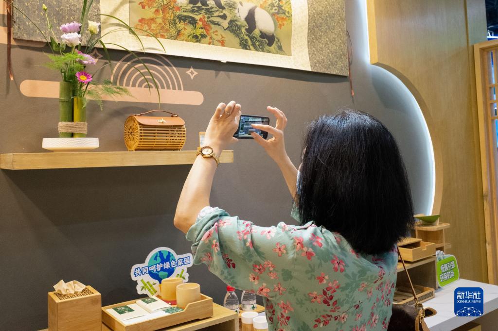 9月1日,观众在国家会议中心国际竹藤组织展台拍摄竹制展品。