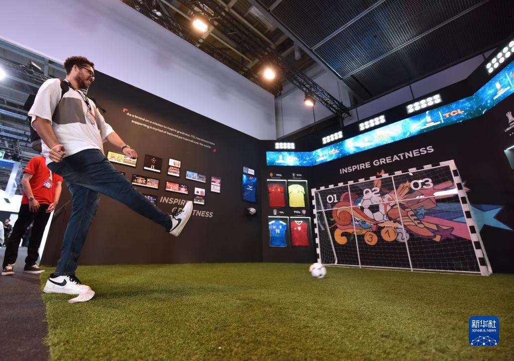 9月1日,参观者在德国柏林国际消费电子展TCL展区体验射门游戏。