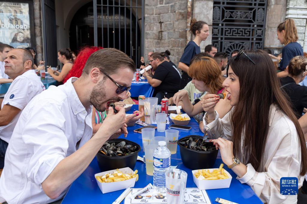 9月2日,人们在法国北部城市里尔品尝贻贝。里尔旧货市场上,“贻贝-薯条-啤酒”的组合是游客们的最爱。