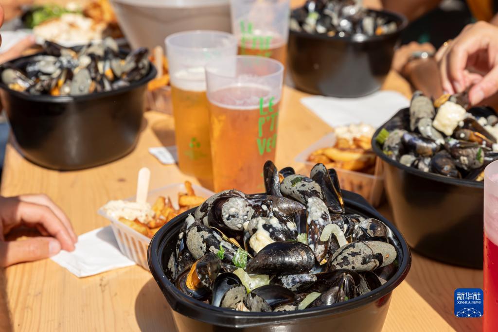 9月3日,在法国里尔旧货市场上,人们享用贻贝、薯条和啤酒。
