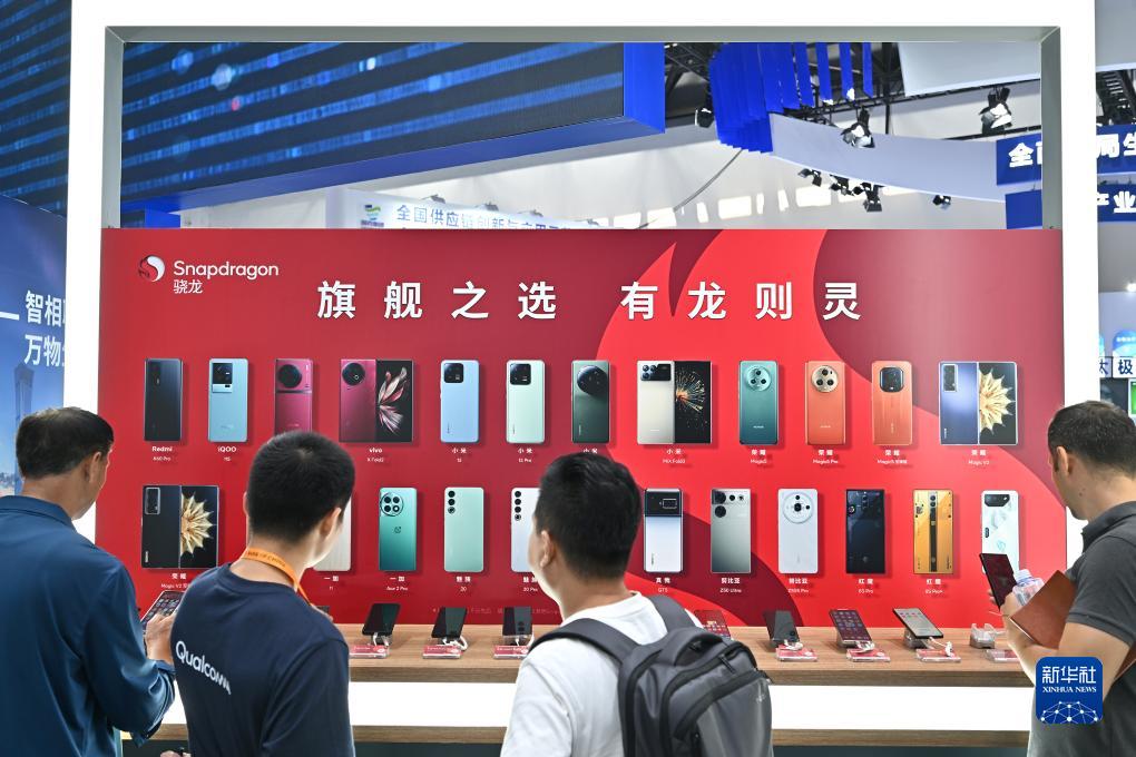 9月4日,参观者在国家会议中心的高通展台了解搭载了高通骁龙芯片的手机。
