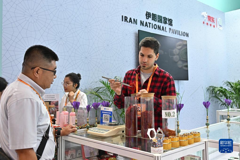 9月4日,一名参观者在服贸会国家会议中心的伊朗展台购物。