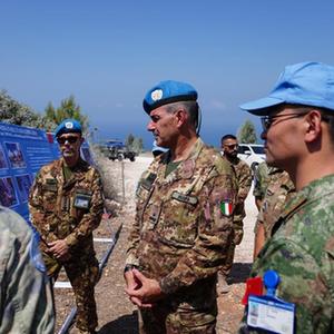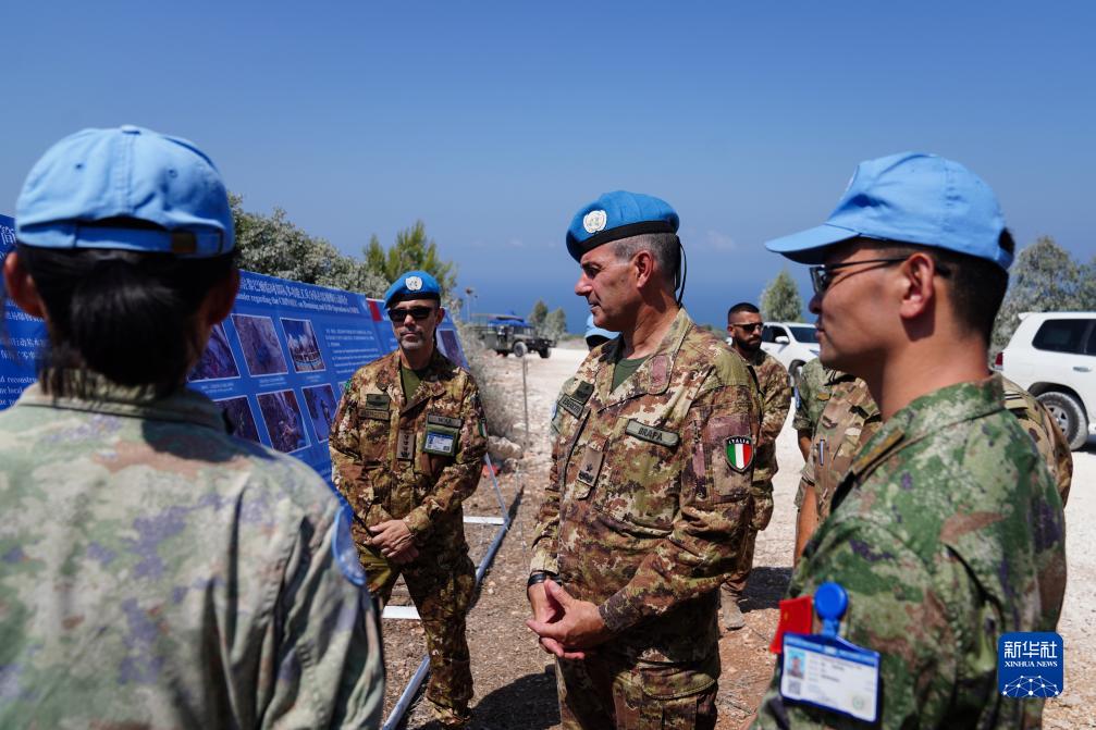 9月4日,联合国驻黎巴嫩临时部队(联黎部队)西区司令乔瓦尼·布拉法准将(左二)进入黎巴嫩南部“蓝线”附近的中国第21批赴黎维和部队任务雷场。新华社发(李竹林 摄)