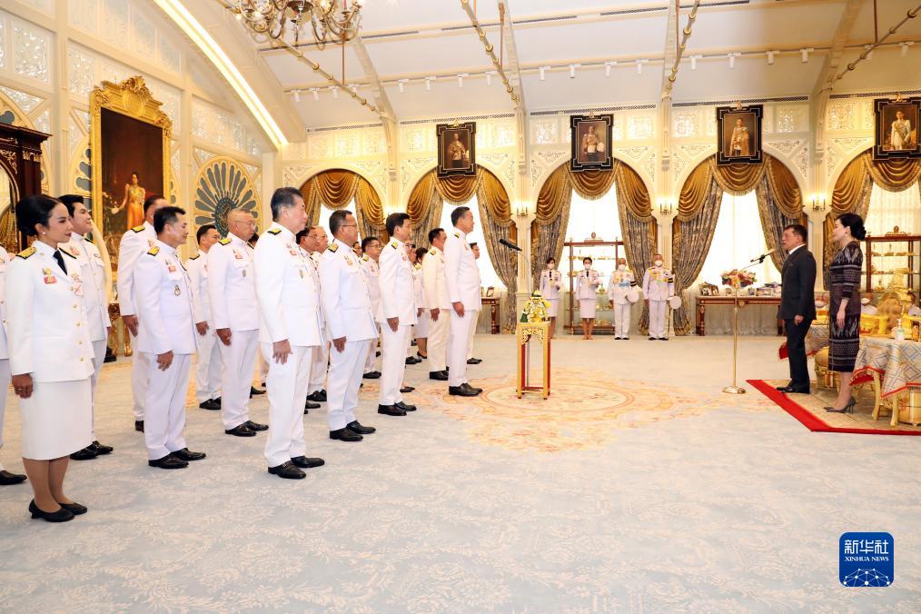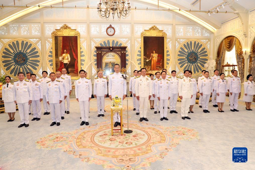 9月5日,在泰国曼谷律实宫,泰国总理赛塔·他威信(中)及新一届内阁向国王玛哈·哇集拉隆功(右二)宣誓就职。新华社发(拉亨摄)