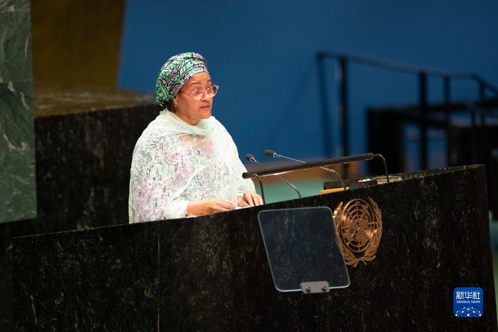 9月5日,在位于纽约的联合国总部,联合国常务副秘书长阿明娜·穆罕默德代表联合国秘书长古特雷斯在第78届联合国大会第一次全会上致辞。