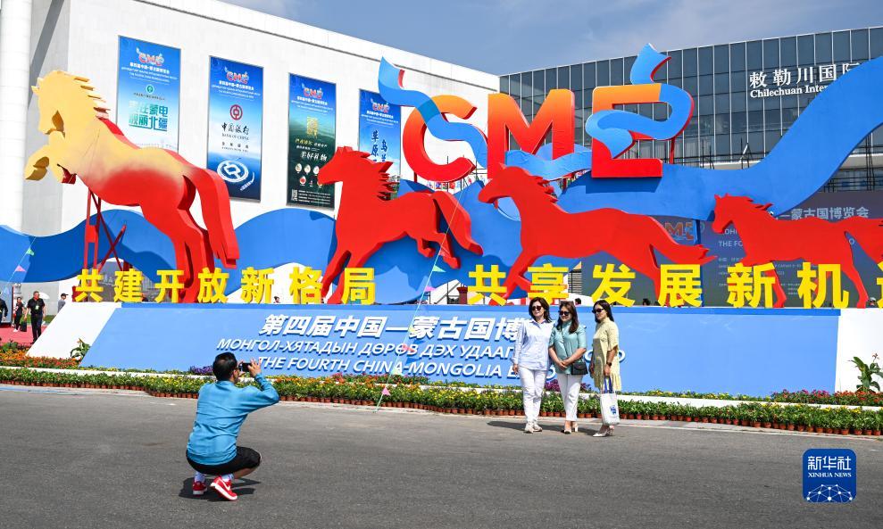 9月6日,游客在第四届中国—蒙古国博览会举办地——内蒙古呼和浩特市敕勒川国际会展中心外合影。