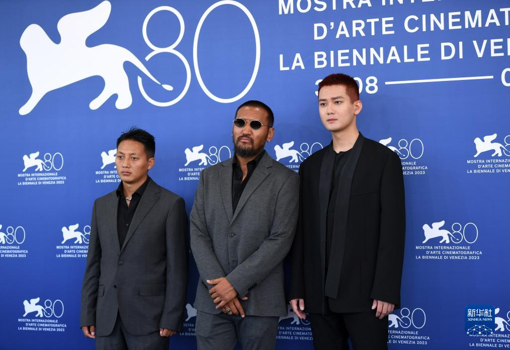 9月6日,电影《雪豹》演员才丁扎西、金巴和熊梓淇(从左至右)出席意大利威尼斯电影节拍照式。