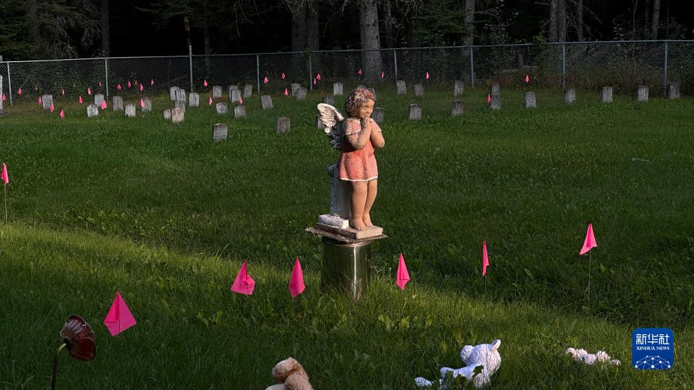 这是8月31日在加拿大萨斯喀彻温省博瓦尔印第安人寄宿学校旧址拍摄的用粉色旗子标出的疑似儿童和婴儿墓地。