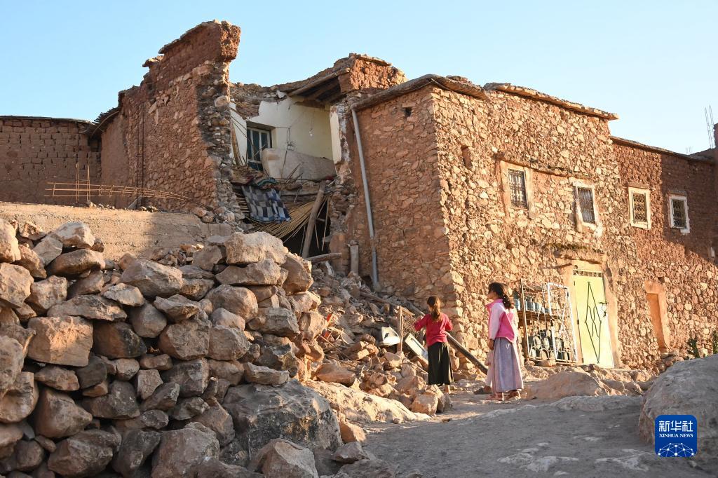 9月9日,在摩洛哥马拉喀什附近,孩子们站在遭地震损毁的建筑旁。