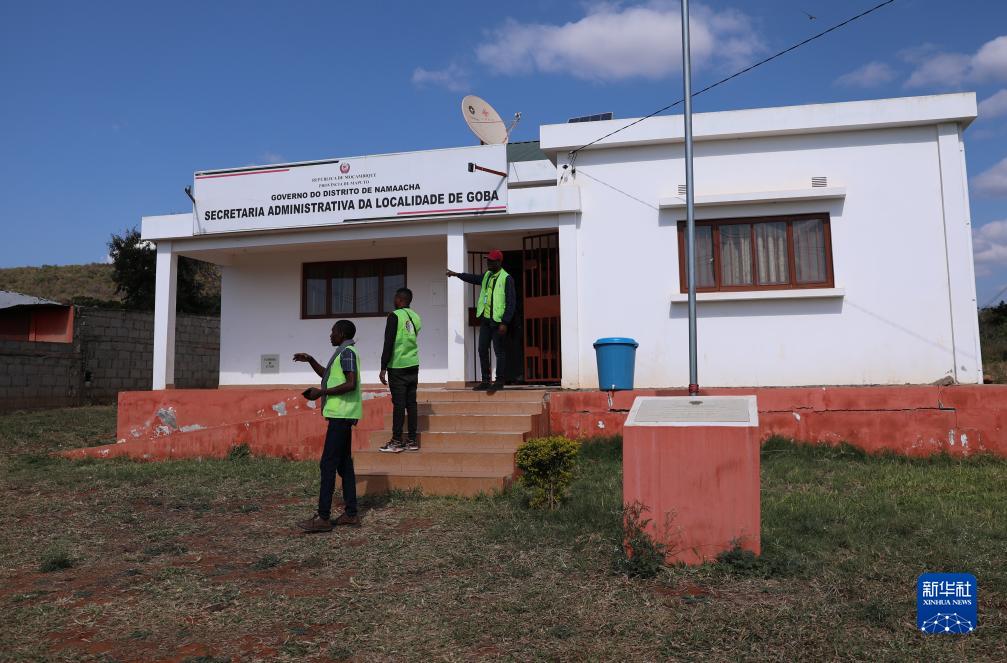 7月26日,在莫桑比克马普托省戈巴村,瓜达吉亚与同事在装有中国援助的卫星电视接收天线的房屋前交流。