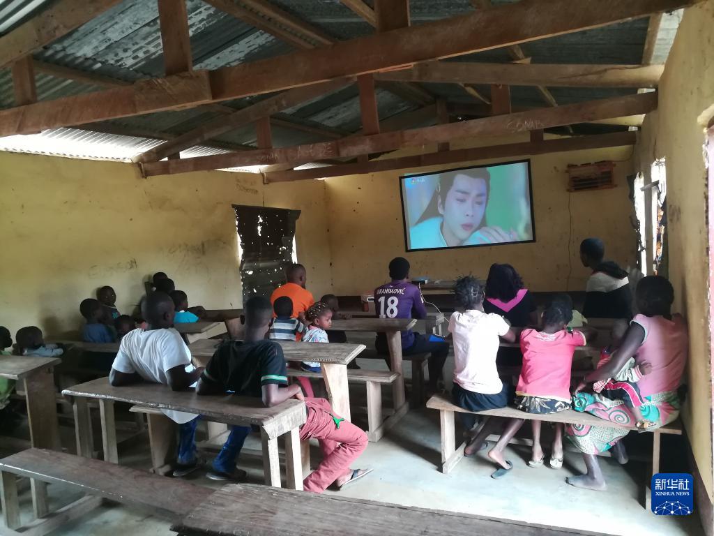 人们在莫桑比克索法拉省梅图希拉村收看投影电视节目(2019年5月13日摄)。