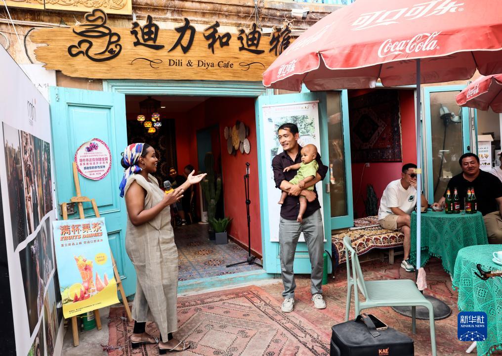 海迪雅(左)在自家咖啡馆前唱歌,并与丈夫迪力夏提和孩子深情互望(9月7日摄)。