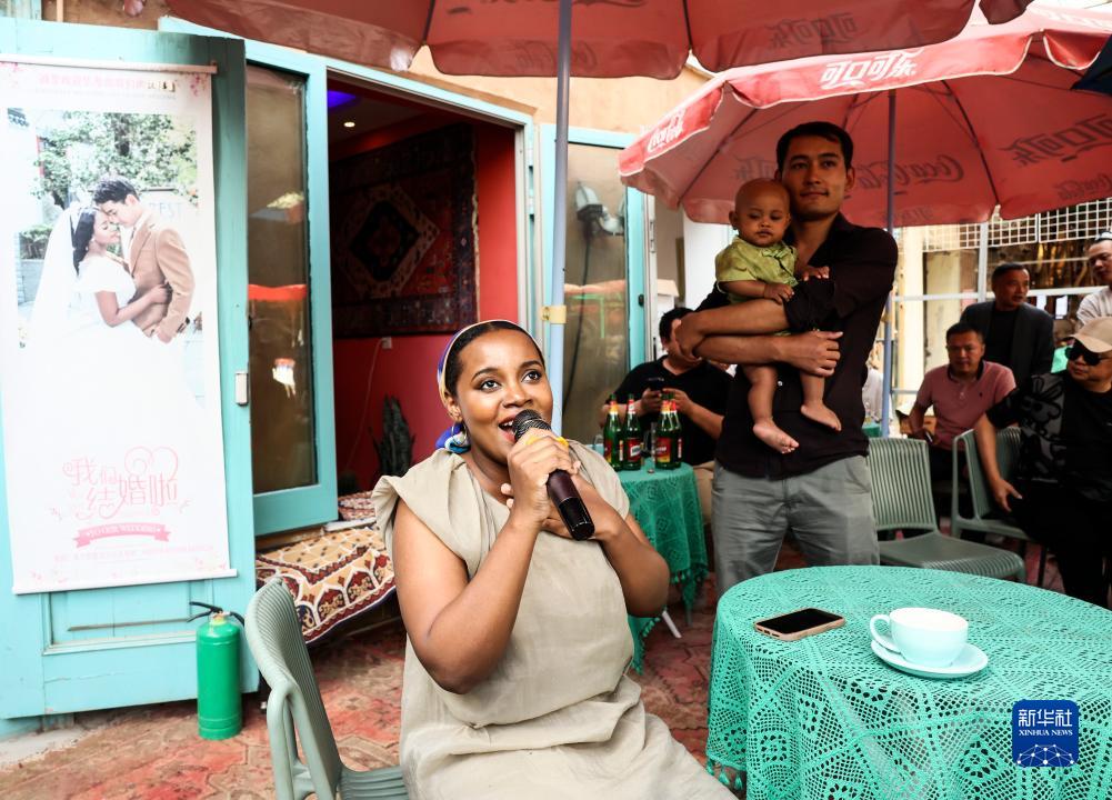 海迪雅在自家咖啡馆前唱歌,丈夫迪力夏提抱着孩子站在其身侧(9月7日摄)。