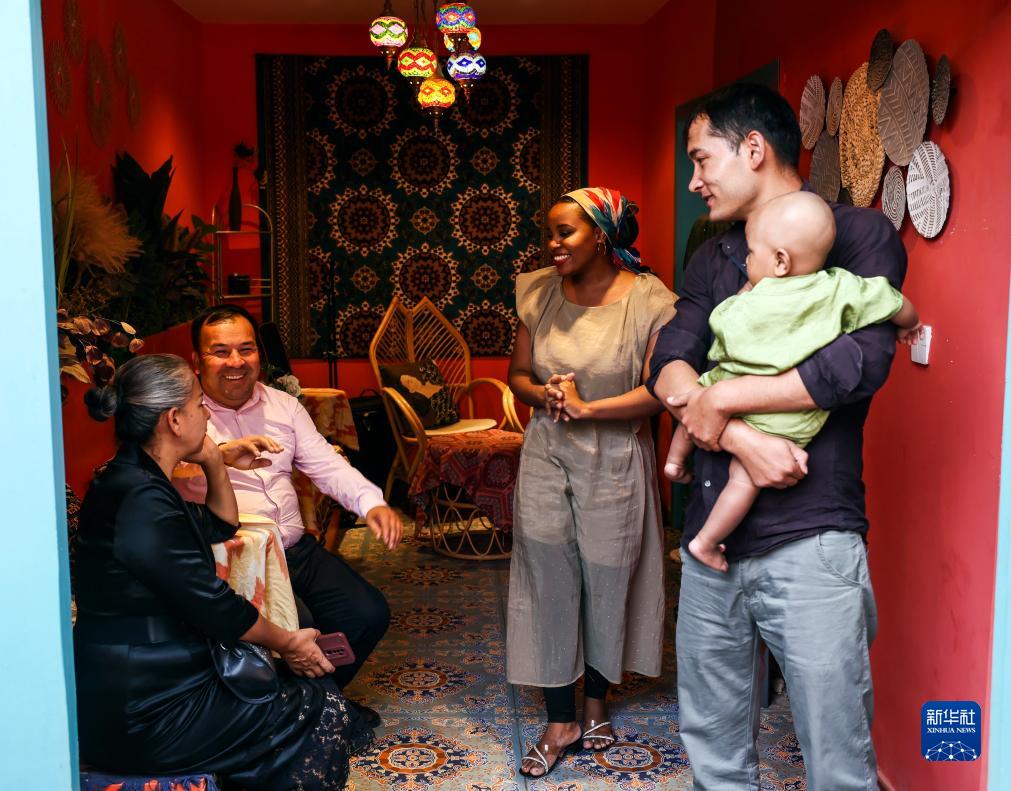 在自家咖啡馆前,迪力夏提(右)抱着孩子和海迪雅与游客交流(9月7日摄)。