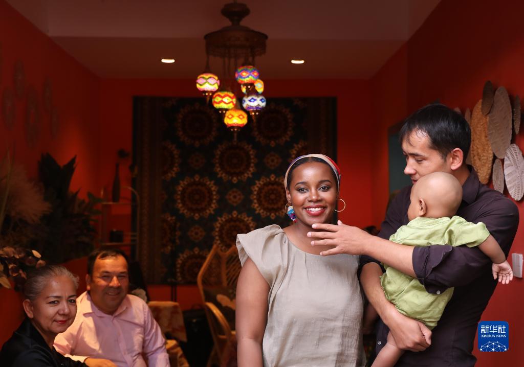 迪力夏提抱着孩子和海迪雅站在自家咖啡馆前(9月7日摄)。
