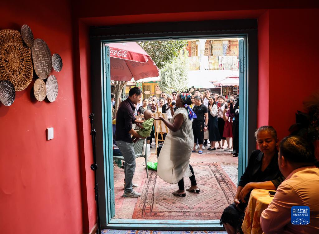 海迪雅(中)在自家咖啡馆前唱歌,丈夫迪力夏提抱着孩子与她互动(9月7日摄)。