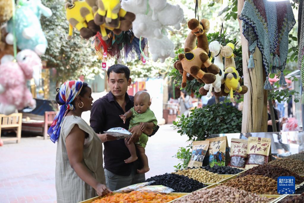 迪力夏提抱着孩子和海迪雅在喀什古城景区的一家店铺前挑选美食(9月7日摄)。