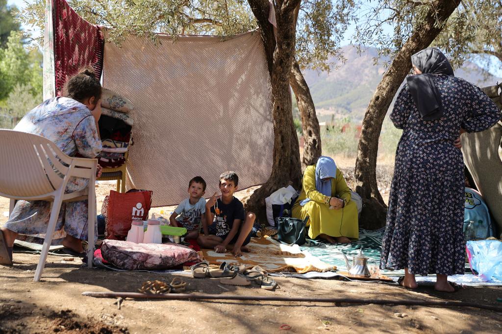 这是9月10日在摩洛哥震中附近的艾米兹米兹村一处临时安置点拍摄的受灾群众。新华社记者 王东震 摄
