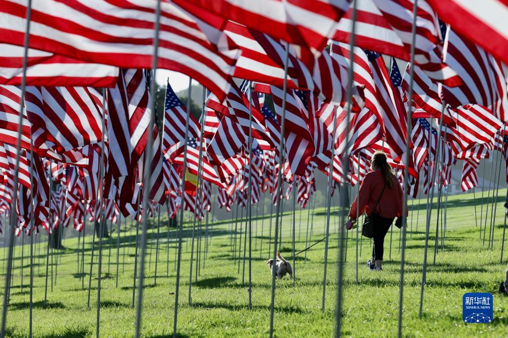 9月10日,一名女子走在美国加利福尼亚州马利布佩珀代恩大学草坪上的“旗海”中。
