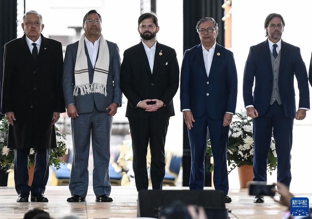 9月11日,在智利首都圣地亚哥,墨西哥、玻利维亚、智利、哥伦比亚和乌拉圭5国总统共同出席悼念活动。新华社发(豪尔赫·比列加斯摄)