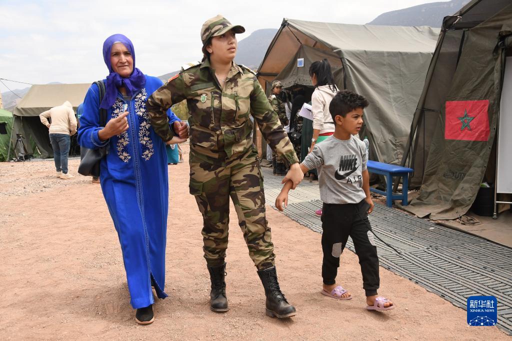 9月12日,救援人员在位于摩洛哥豪兹省艾斯尼村的临时军事医院引导灾民。