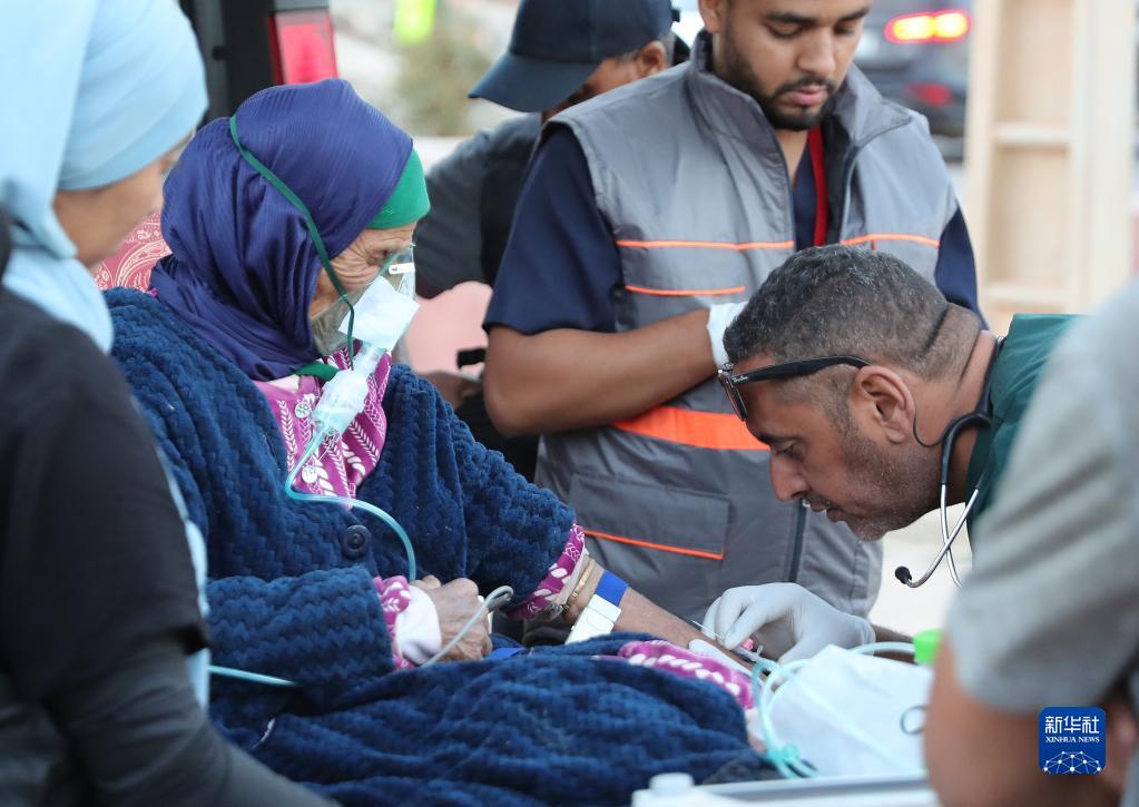 9月12日,在震中区域的摩洛哥豪兹省塔拉特恩雅库布村,救援人员救治一名受伤的老人。
