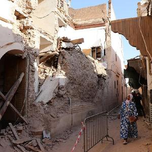 9月13日,人们经过摩洛哥马拉喀什老城的一处震后受损建筑。