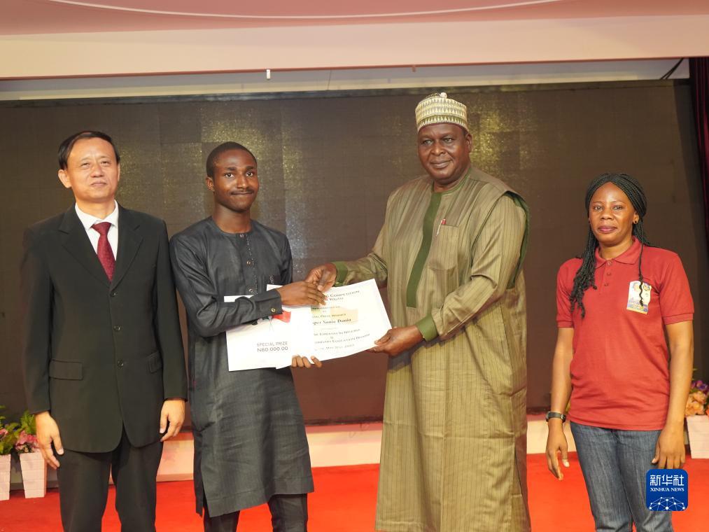 5月31日,在尼日利亚阿布贾中国文化中心,尼日利亚青年达尼亚(左二)在当天举行的颁奖仪式上接过绘画作品获奖证书。新华社发(陈慧玲摄)