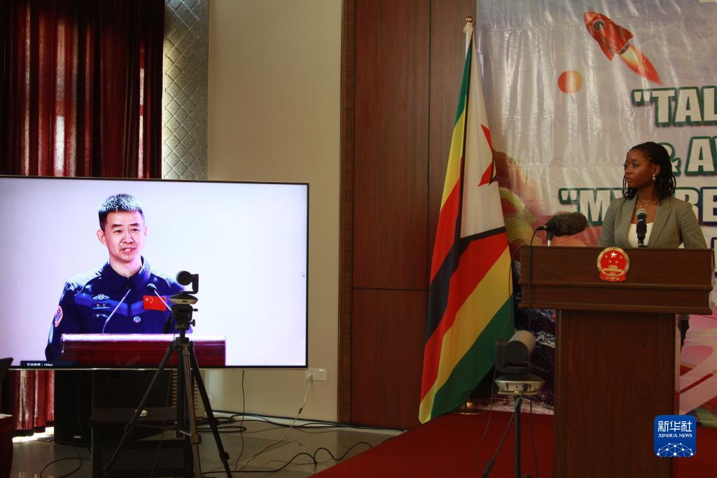 9月13日,在津巴布韦哈拉雷参加“我的梦想”主题绘画颁奖仪式的一名津巴布韦青少年与中国航天员进行视频对话。新华社发(塔法拉·穆格瓦拉摄)