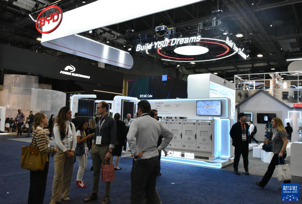 9月12日,人们在美国拉斯维加斯举行的北美最大清洁能源展会RE+展会上参观中国企业比亚迪展区。
